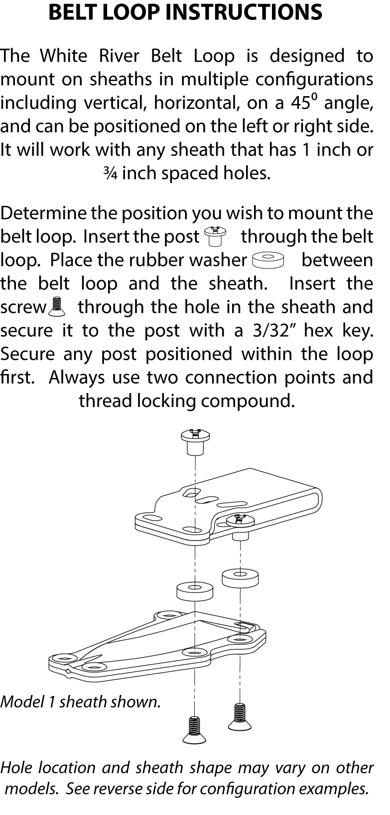 Our multi-position Belt Loop kit for Kydex Sheaths. Designed to be mounted on sheaths with either 1" or 3/4" spaced holes positioned for vertical, horizontal, or 45 degree angles. Includes the Belt Loop, 2 stainless steel screws, two stainless steel posts, 2 rubber spacers, and a hex key.