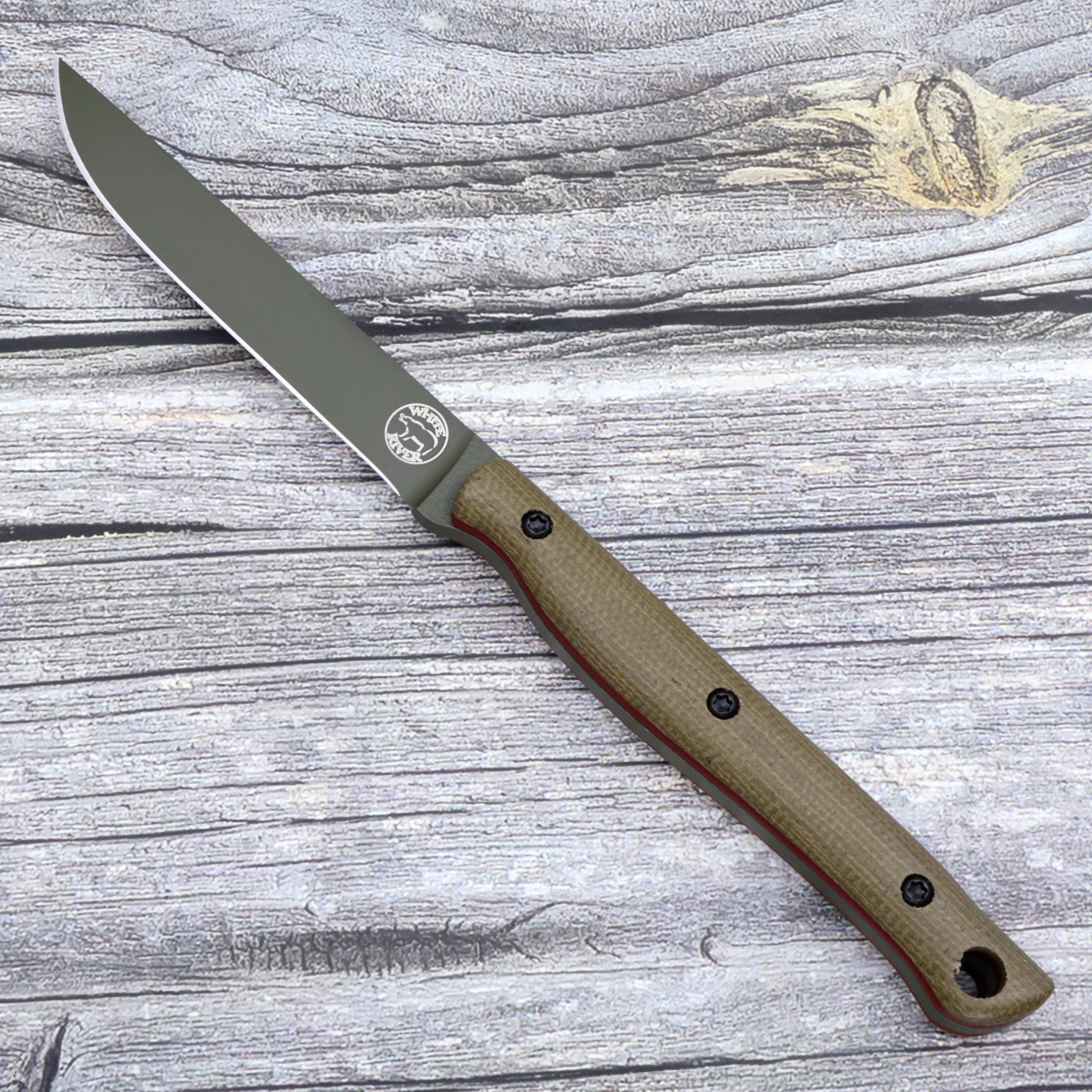 The Exodus 3 with an Olive Drab Cerakote Blade finished with Olive Drab Canvas Micarta & Red G10 liner Handle Scales.