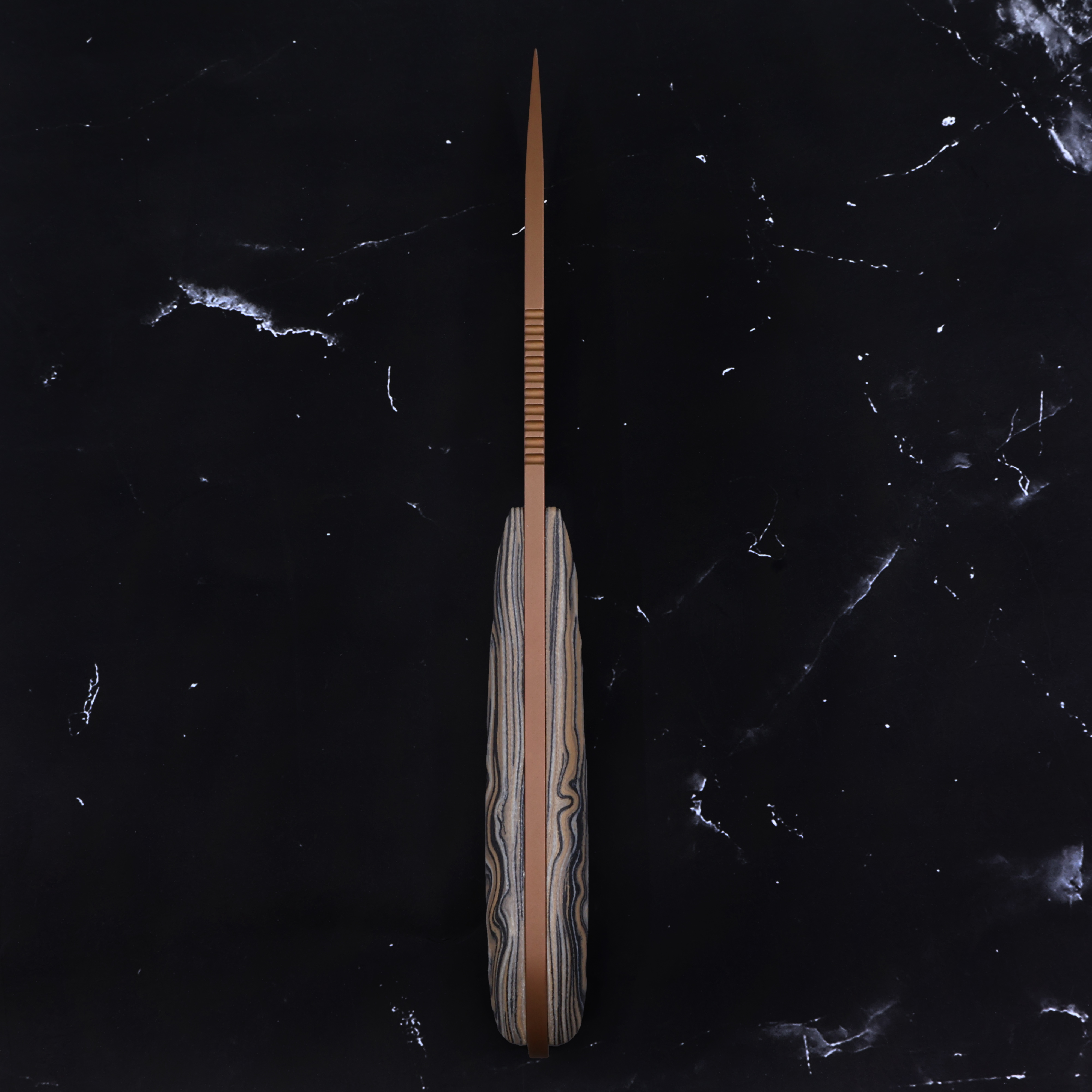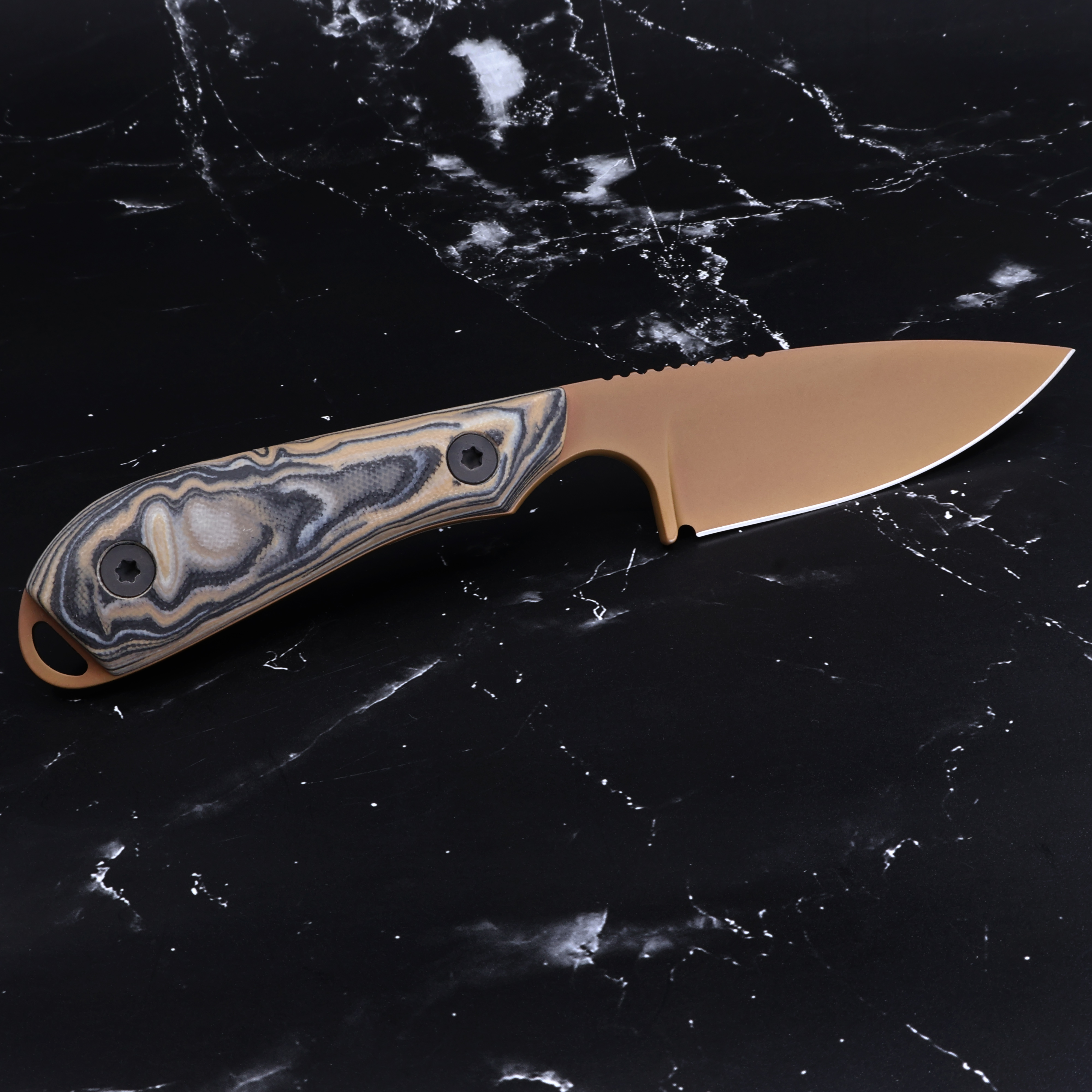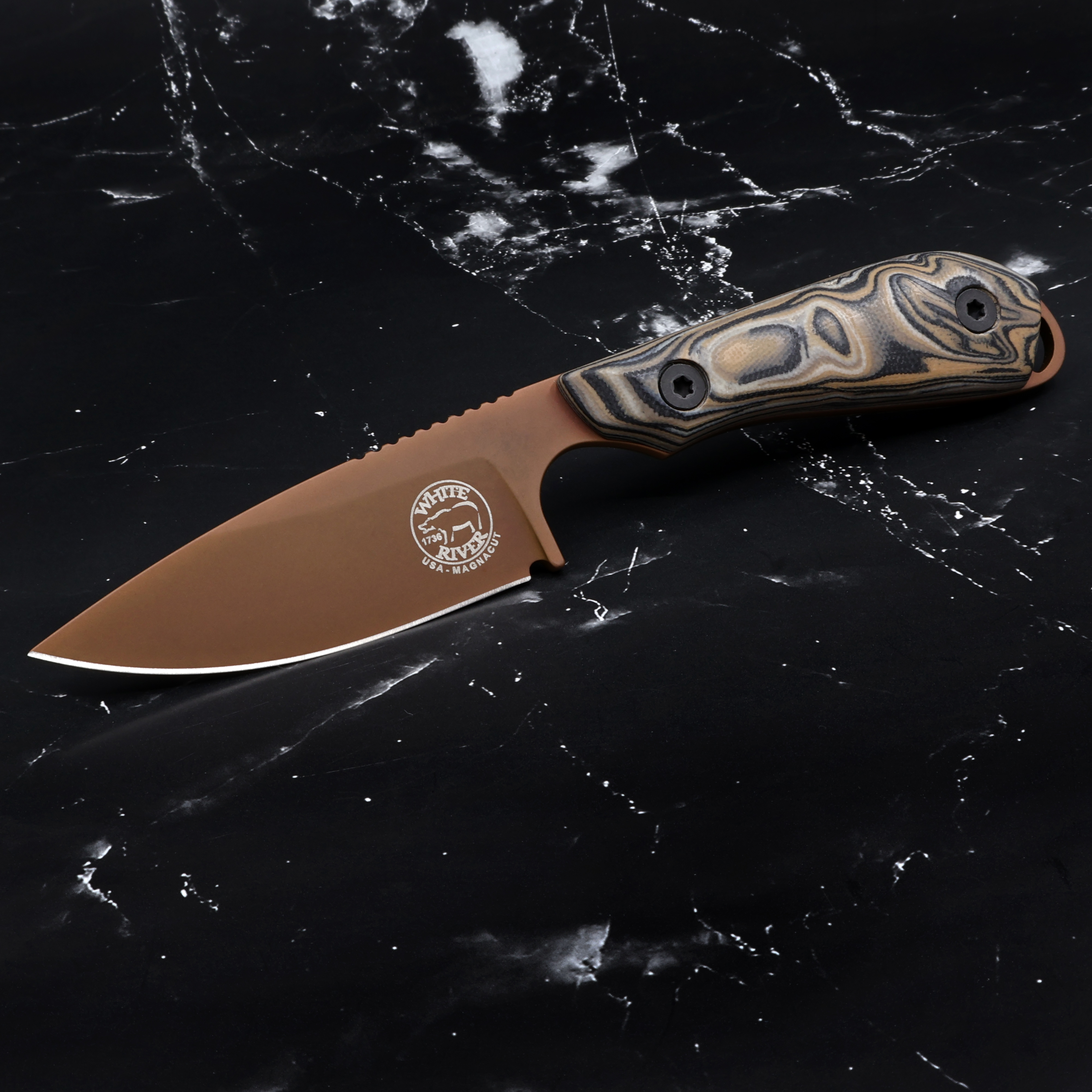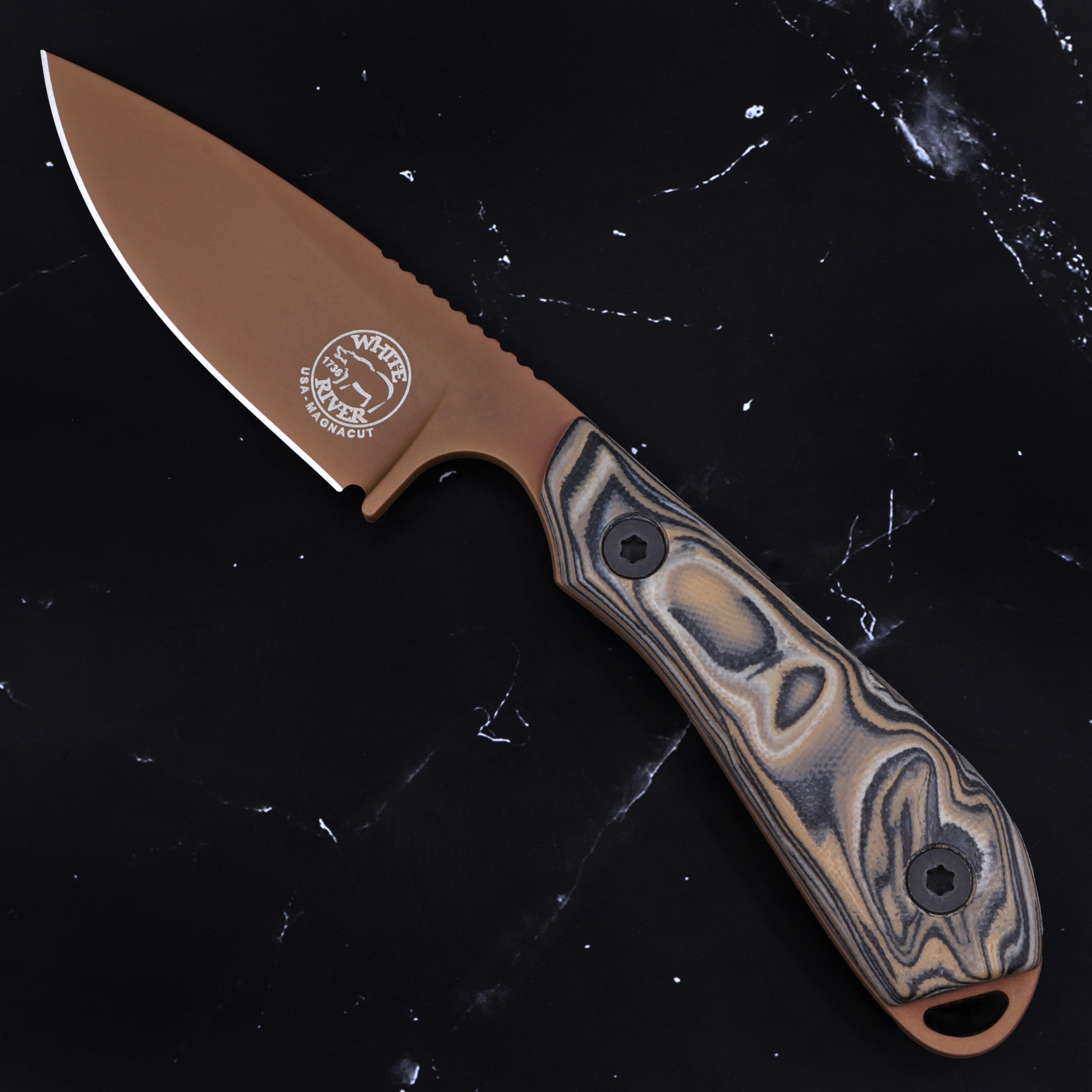 A Custom version of The White River Model 1 Caper with a Custom Copper PVD finish and Black / Tan / White G10 Burl Handle Scales.