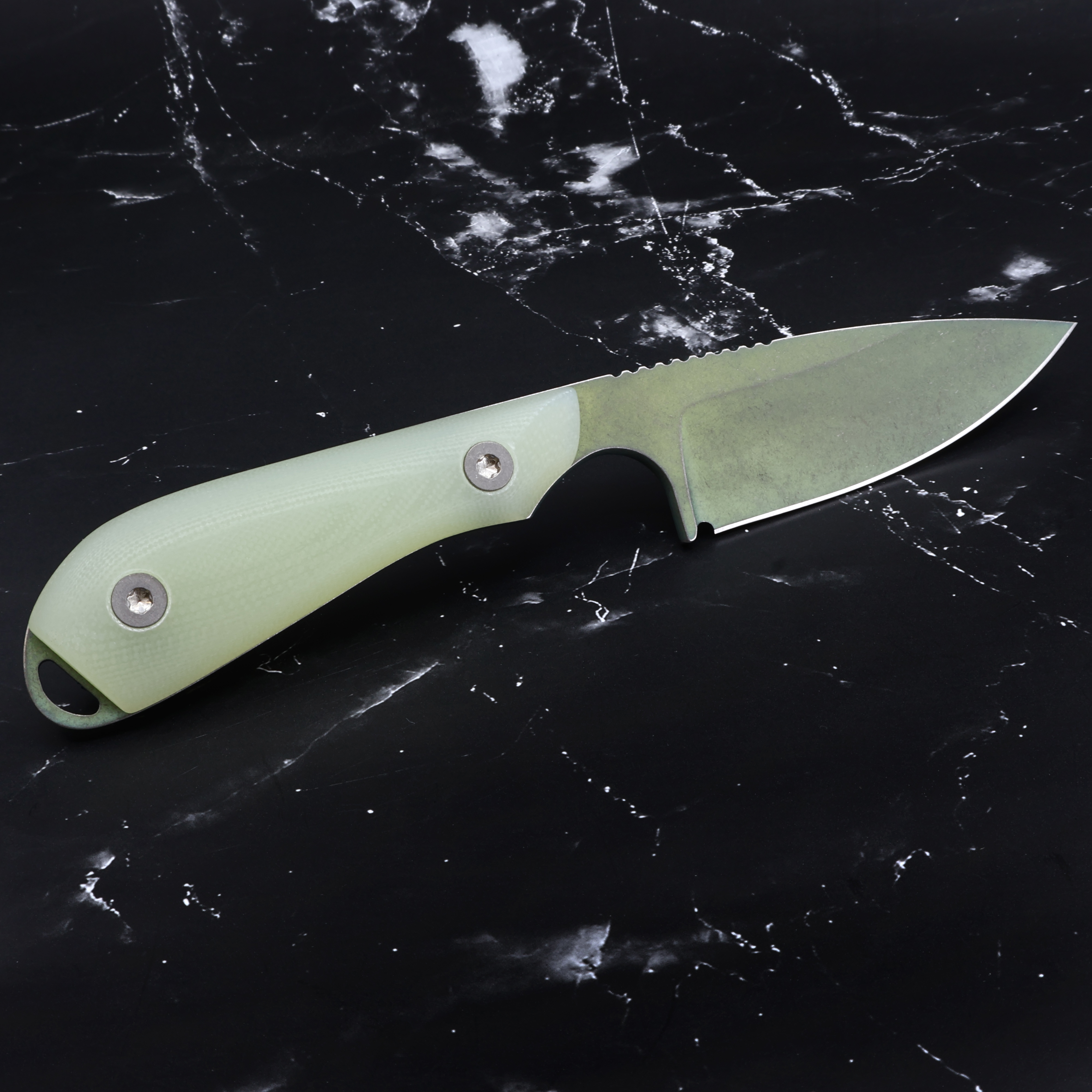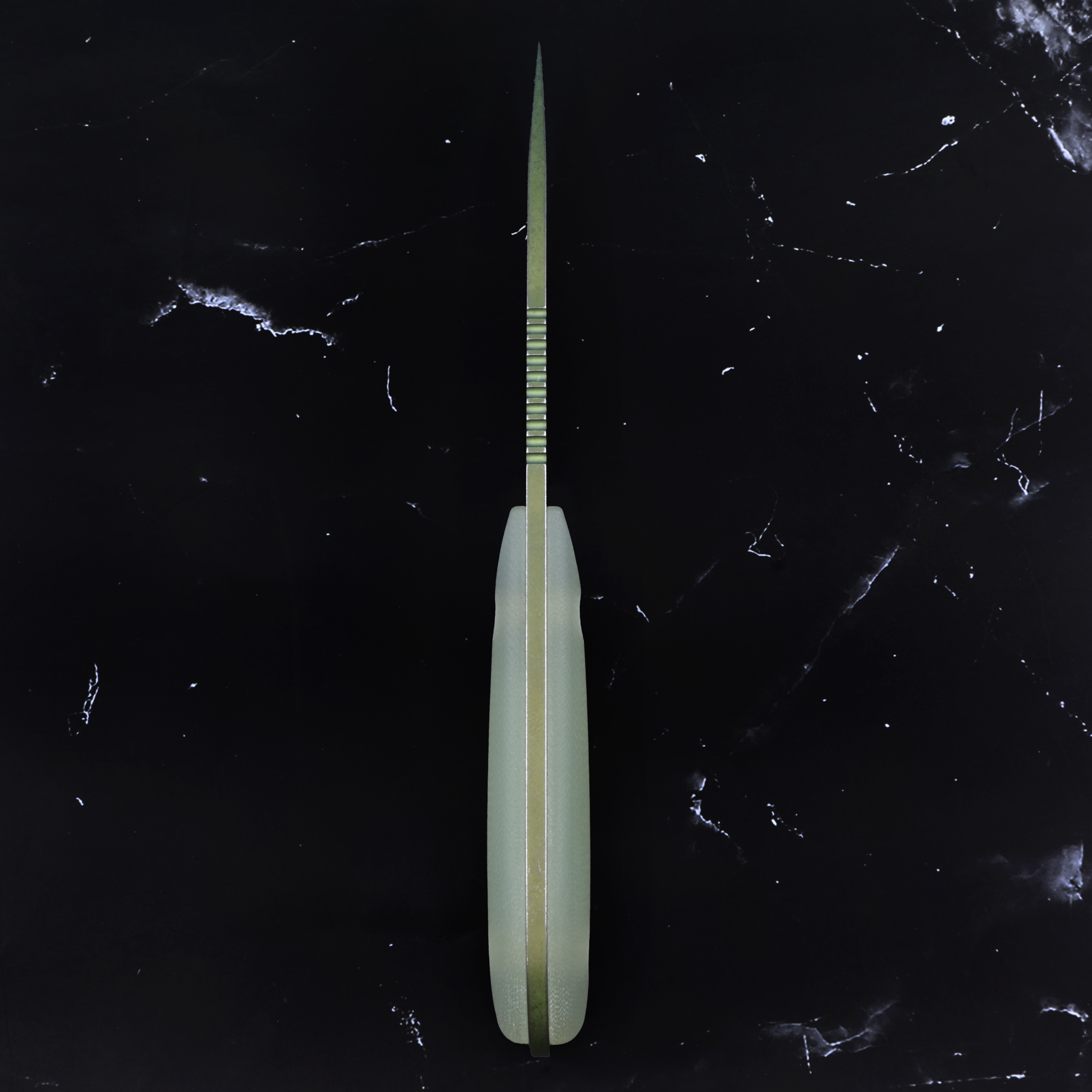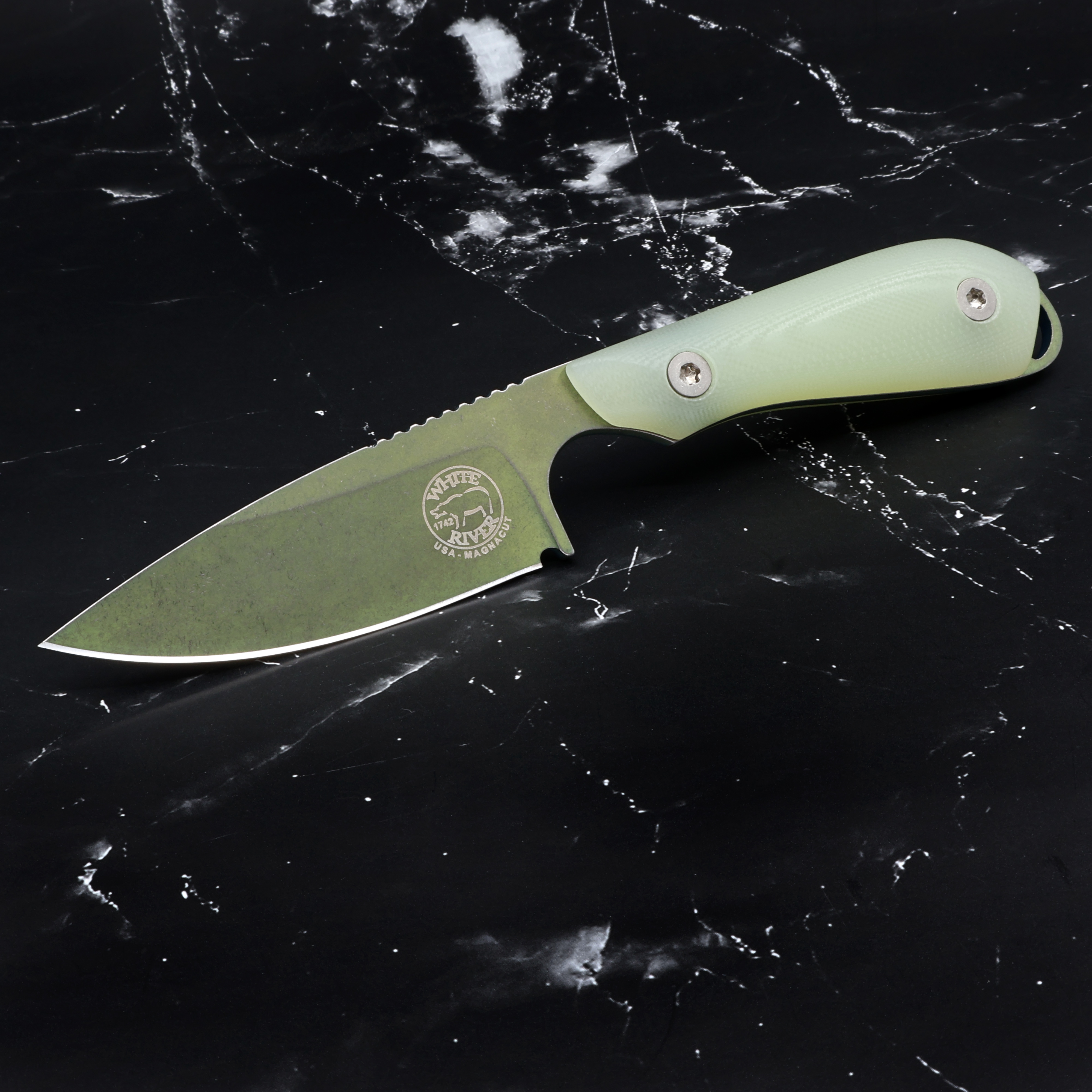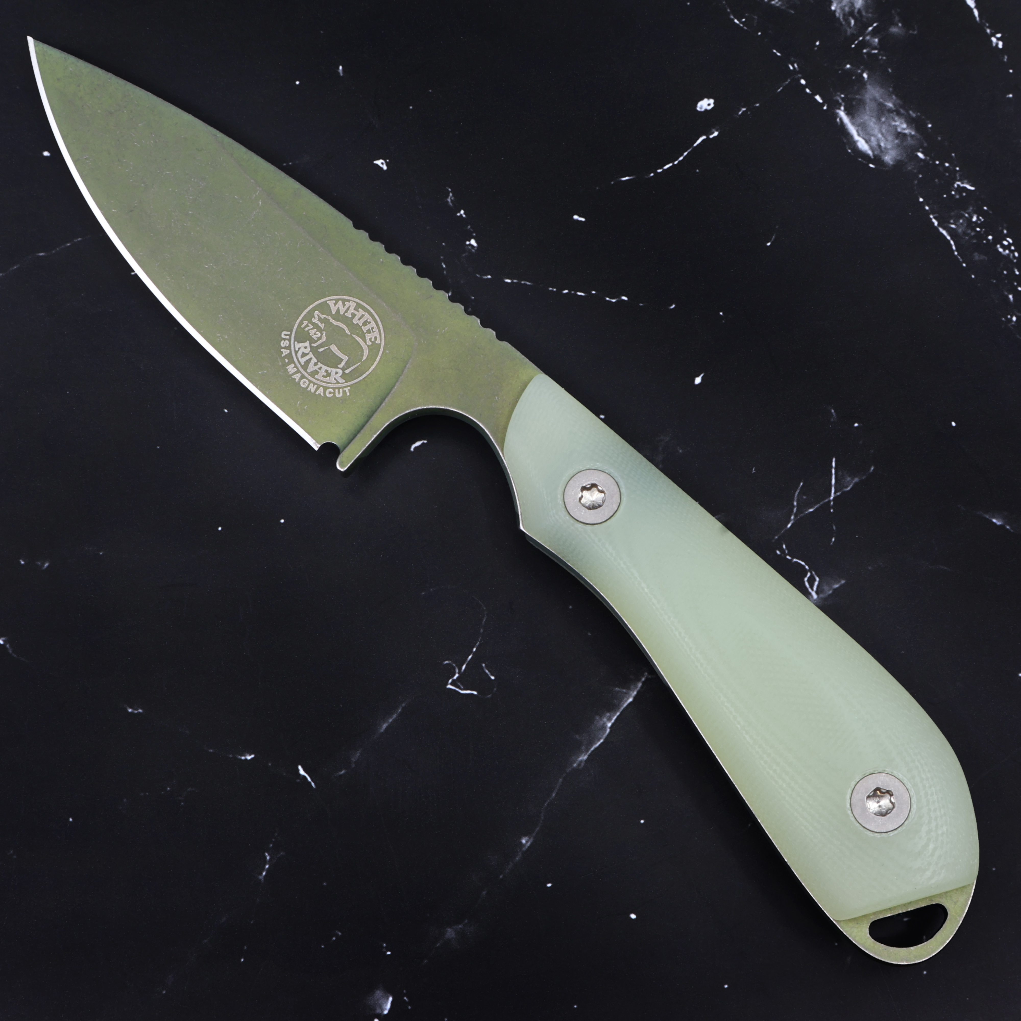 A custom version of the White River Model 1 Caper with Distressed Green PVD blade finish and Jade G10 Handle Scales.