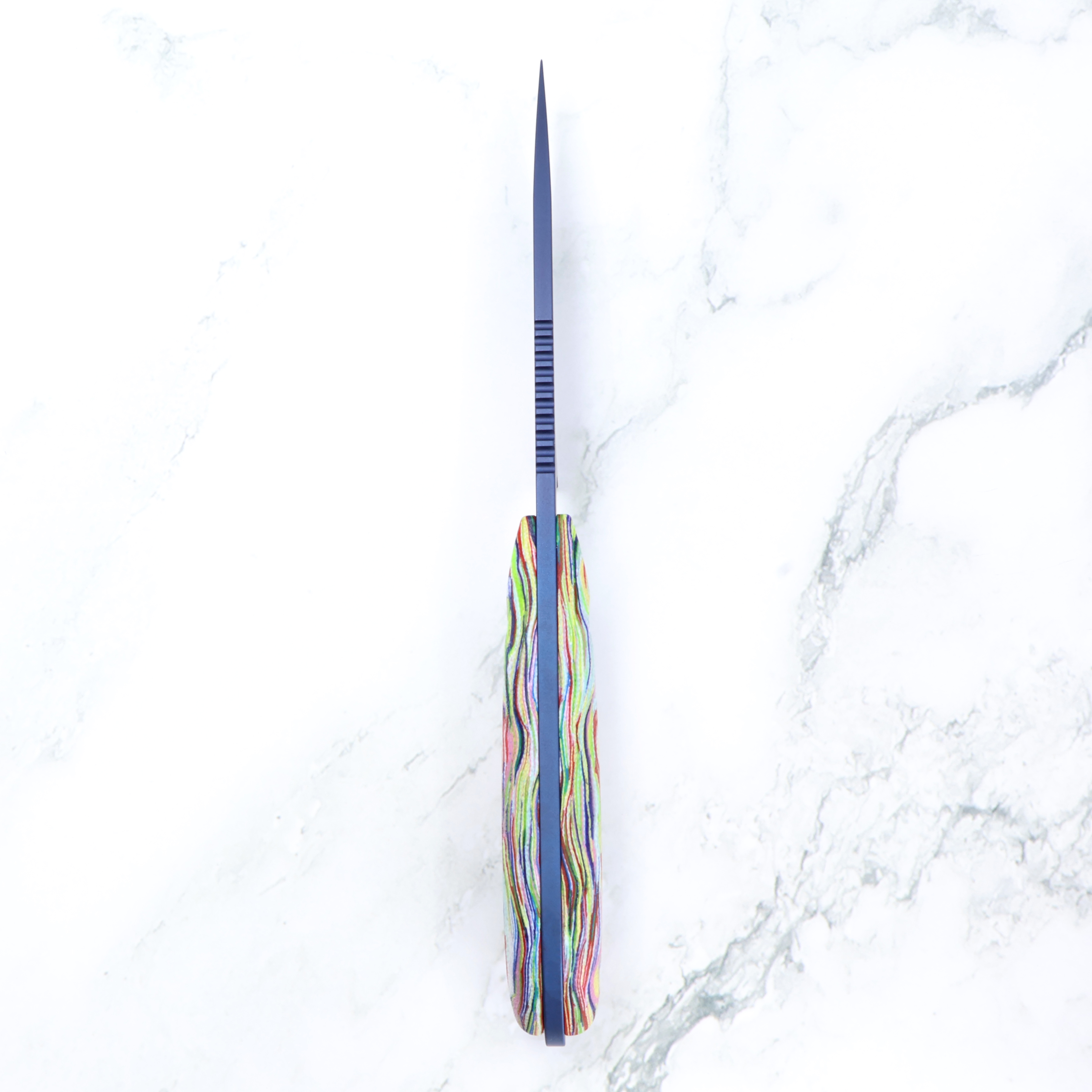 The White River M1 with a custom Vivid Blue PVD finish and Clown G10 Burl Handle Scales.