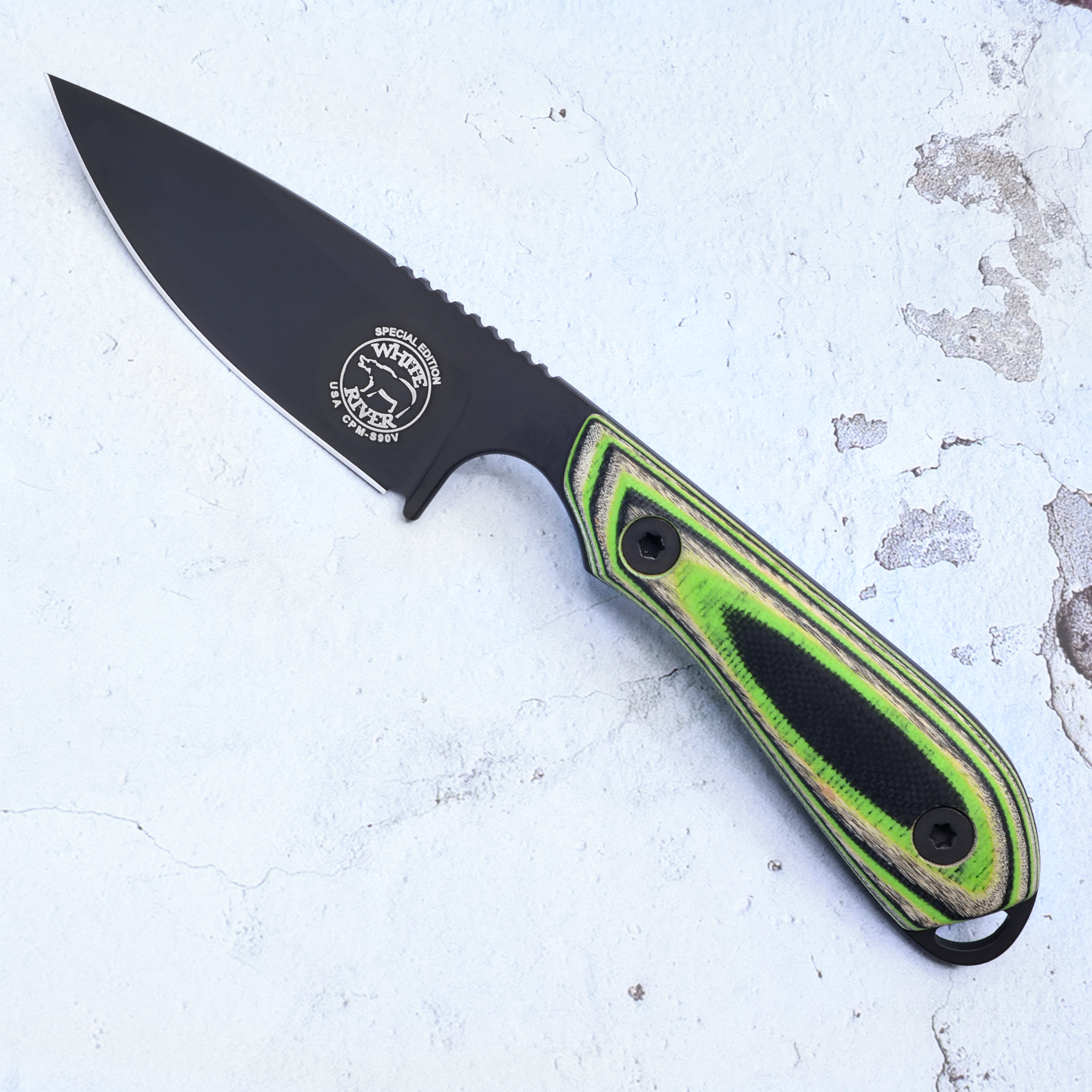 A Custom version of The White River Model 1 Caper with a CPM S90V Steel Blade with a Black PVD finish, and a custom Black / Green G-wood Handle.