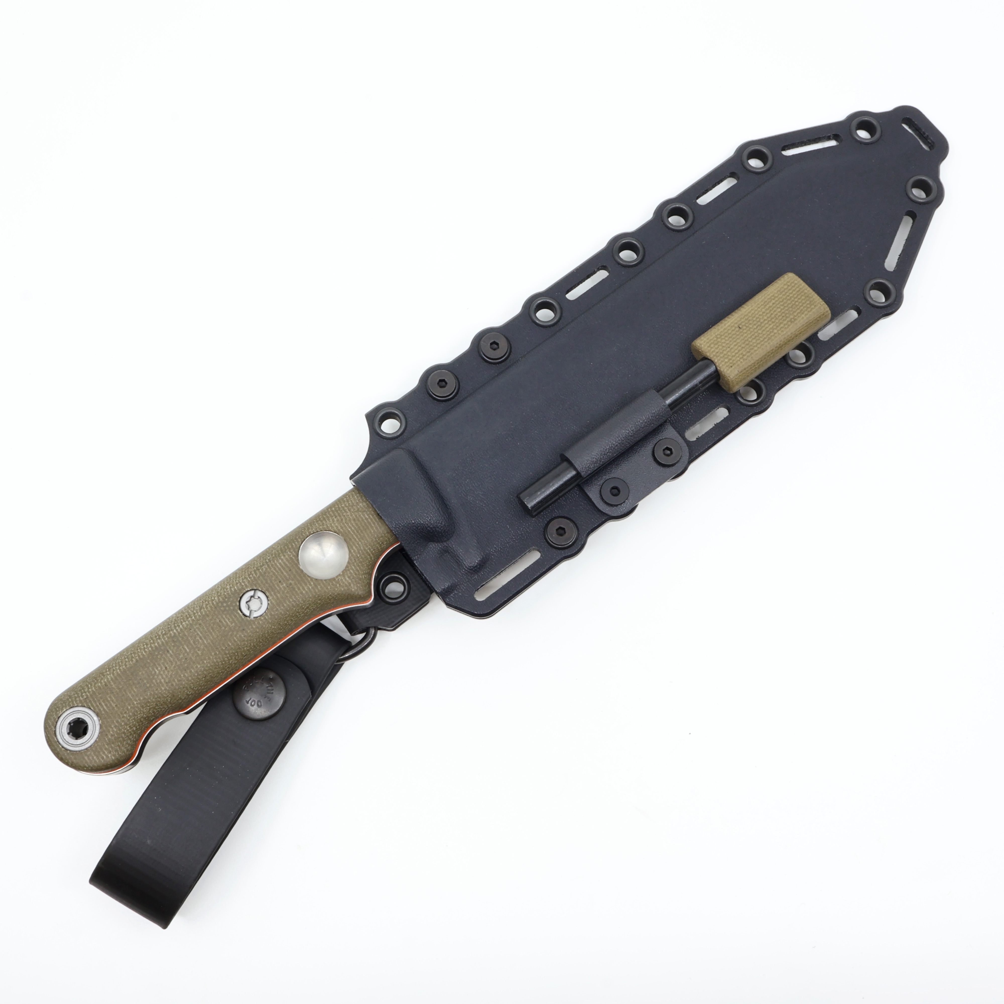 Designed for heavy use in real survival situations these also make excellent camp, hunting, backpacking or utility knives. The deep finger choil protects fingers while applying pressure whittling, cutting or chopping. Atop the blade is a notch for efficient striking of a ferro rod and one is included with each knife. Features a polished stainless steel divot for use with a fire bow. This is a well-designed, great looking, and robust knife intended for serious work. The FC7 is outfitted a Kydex sheath.
