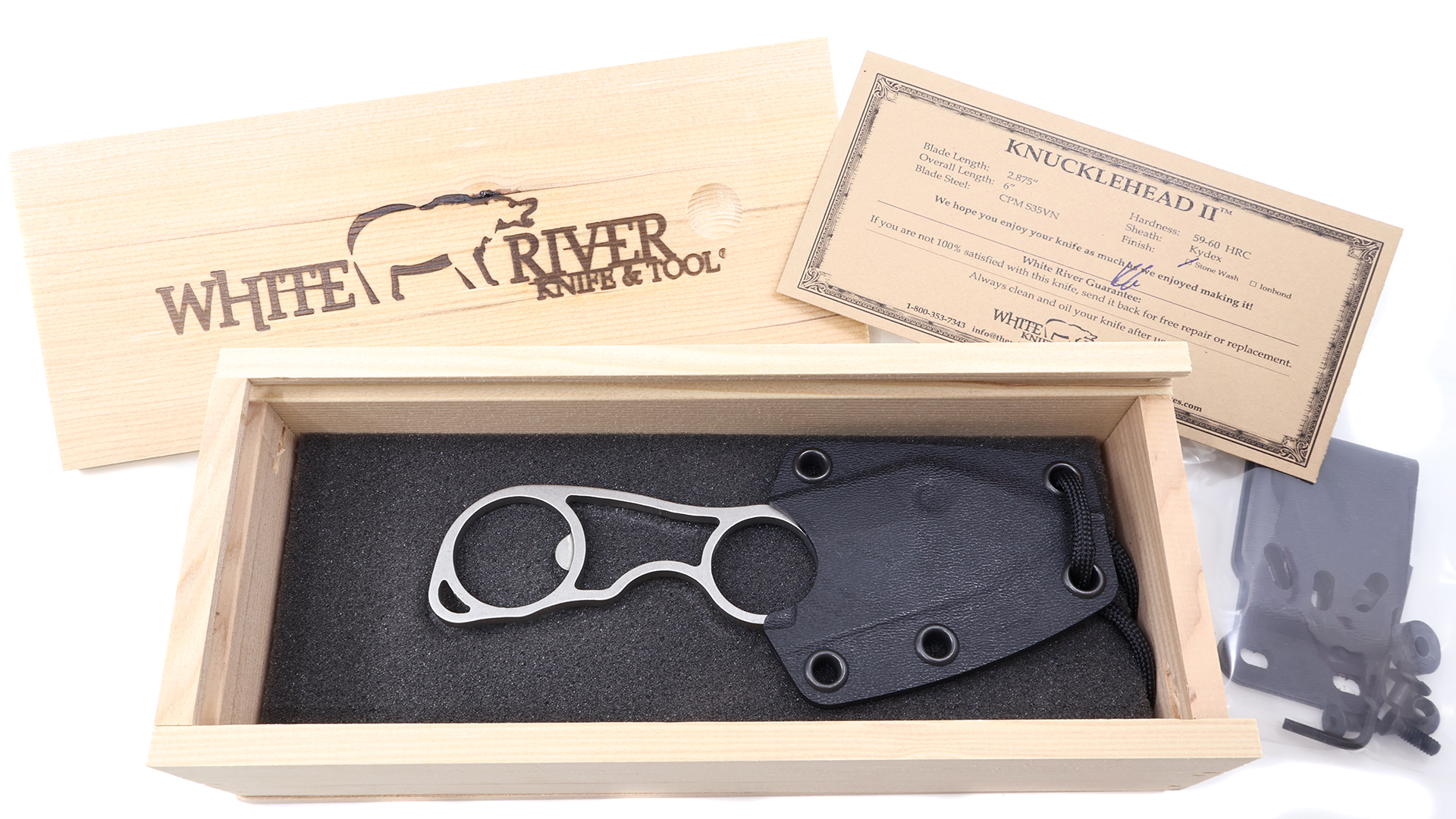 A tough, lightweight every day carry knife. Strong enough for most tasks, but discreet and easy to conceal. Unlike the chisel grind on the original Knucklehead, the Knucklehead II features a more conventional double bevel ground, hand sharpened, leather honed blade. Stone washed, textured finish steel. Easy to grip skeleton handle design complete with bottle opener. Wear it on your neck, boot, or belt. Includes a Kydex sheath.