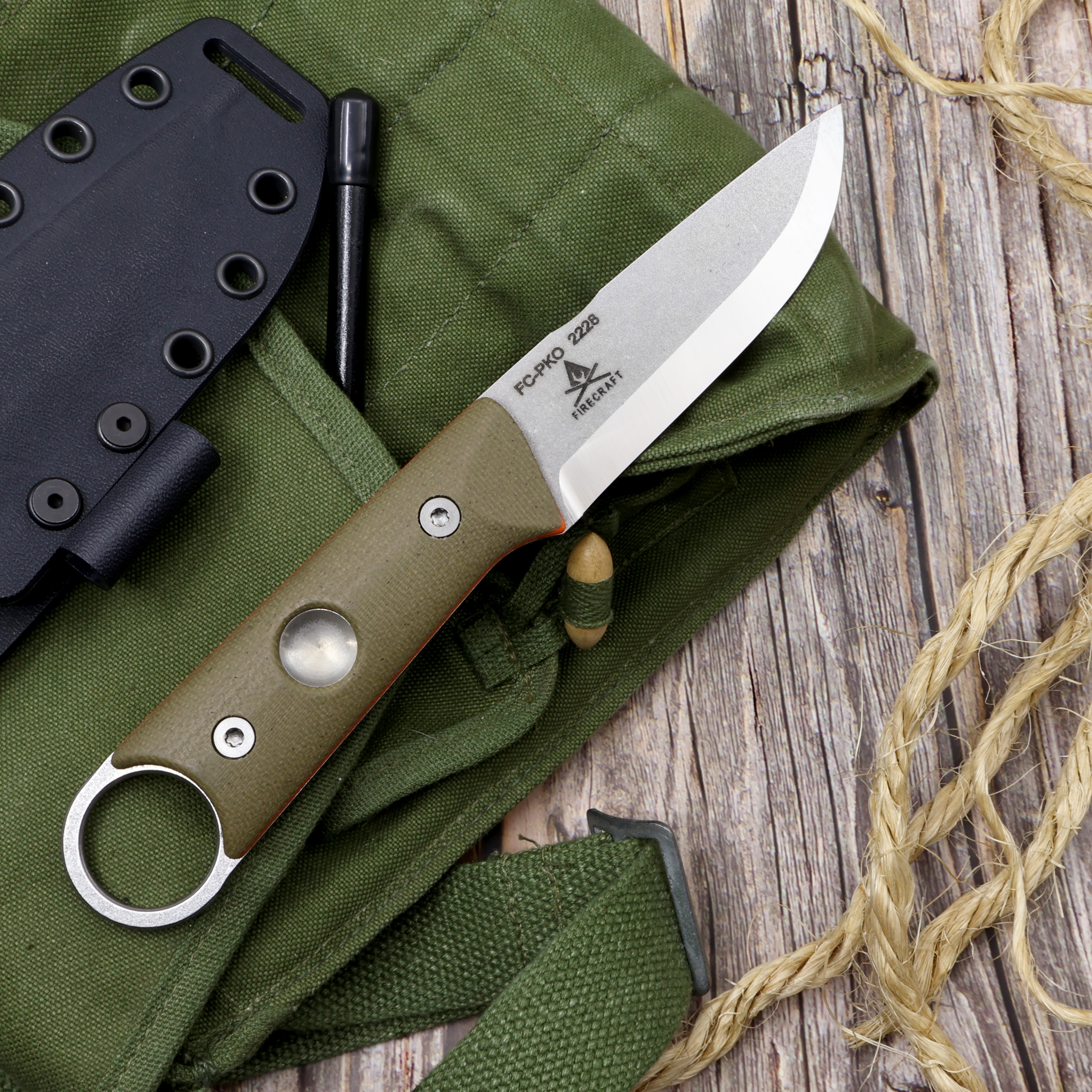 The FC-PKO is a puukko inspired knife design with a traditional style "scandi-grind" edge and modern features. Atop the blade is a notch for efficient striking of a ferro rod and one is included with each knife. Features a polished stainless steel divot for use with a fire bow. Includes a Kydex sheath.